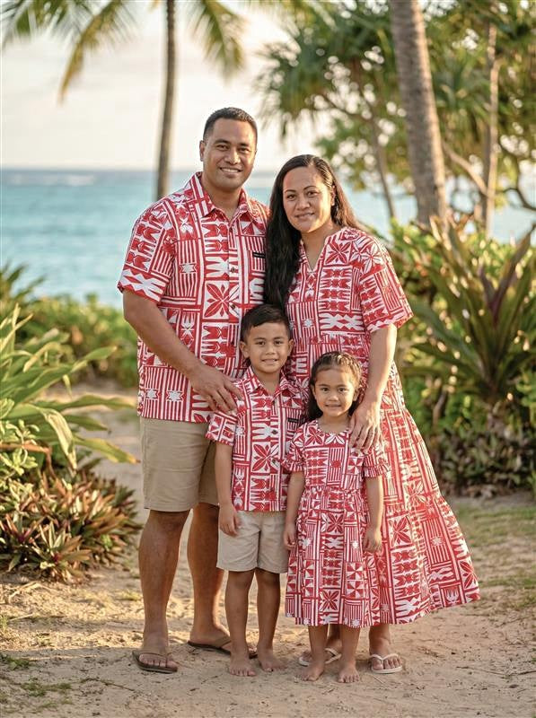 • Coordinated Print: Signature geometric tapa and floral motifs in a high-energy red and white palette.