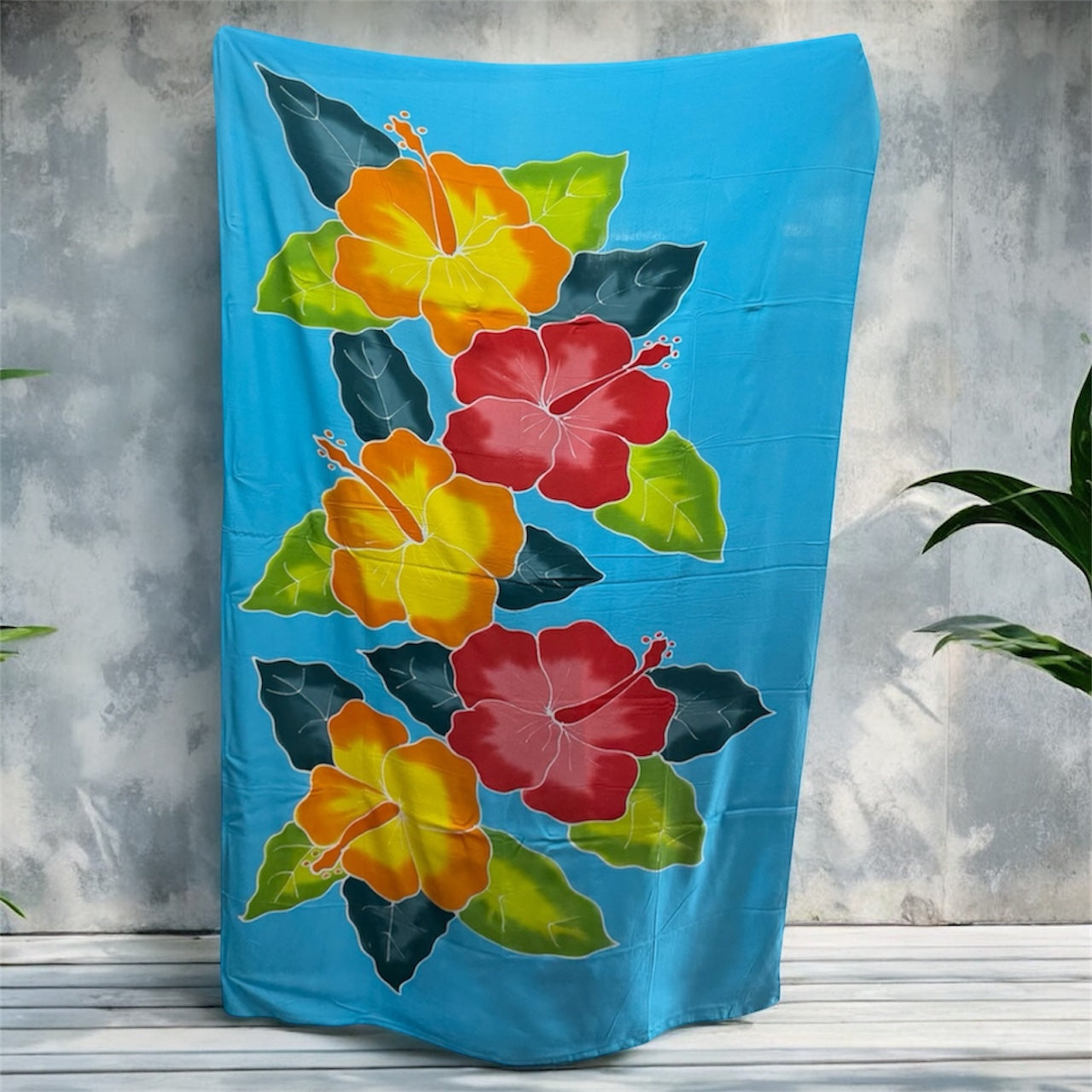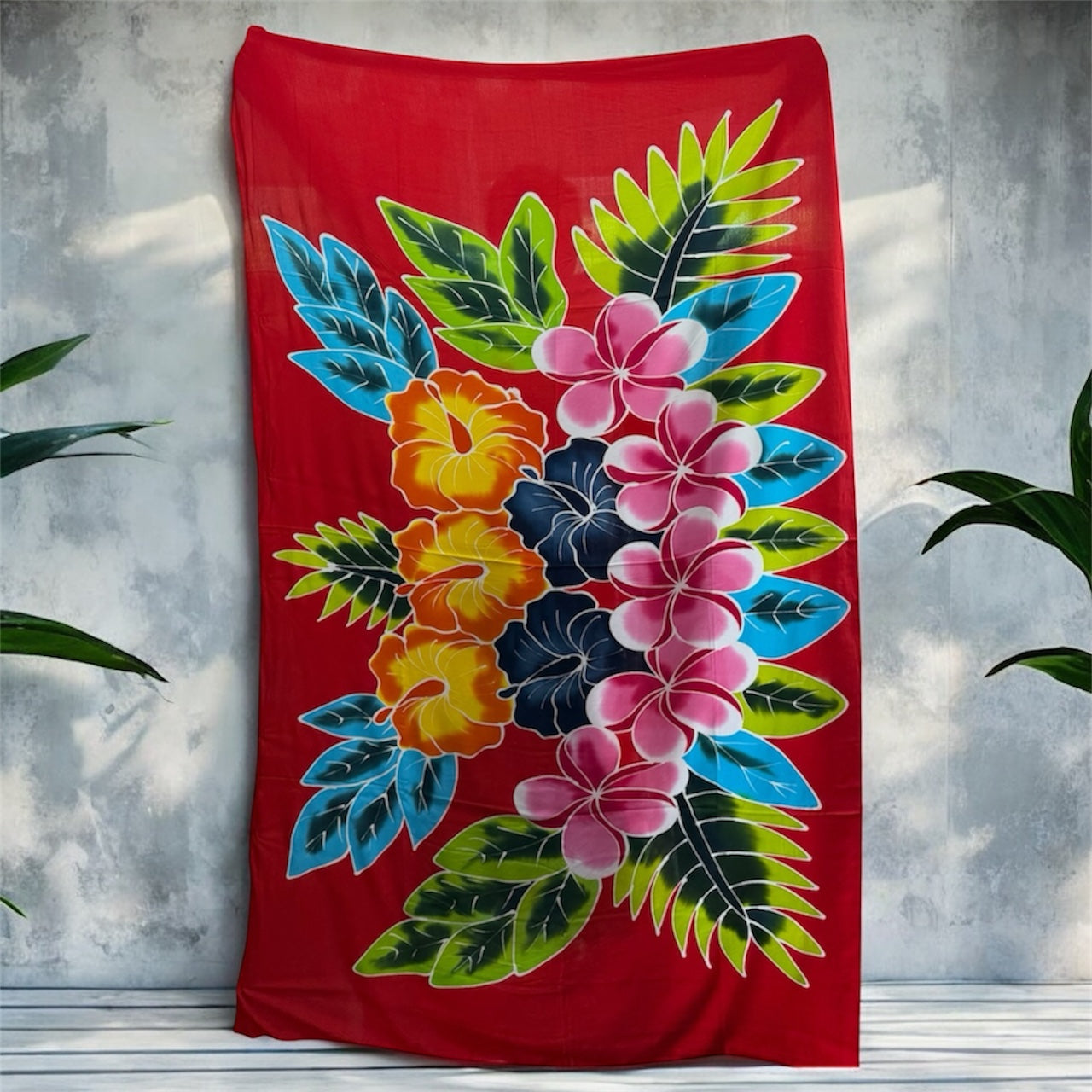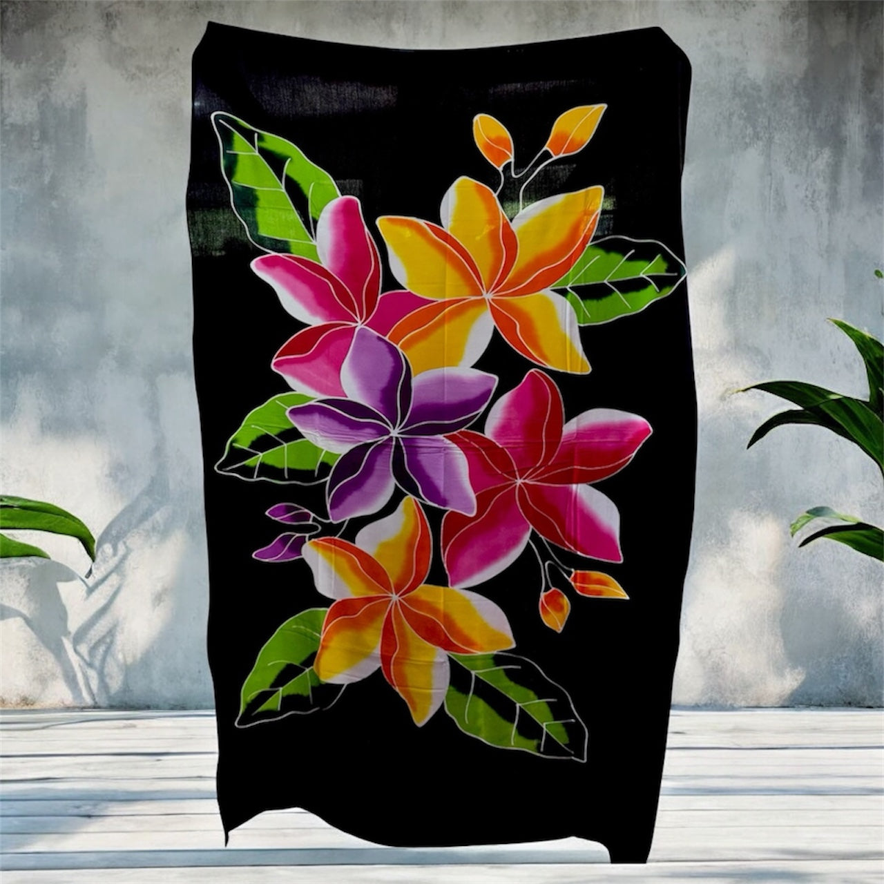 Crafted from a soft, lightweight fabric (such as rayon or similar), these beautiful wraps feature a bold central motif of colorful, exotic flowers like Hibiscus, Plumeria (Frangipani), and Orchids, set against a variety of rich, eye-catching background colors. The vibrant, hand-dyed look makes each piece feel like a unique work of art.