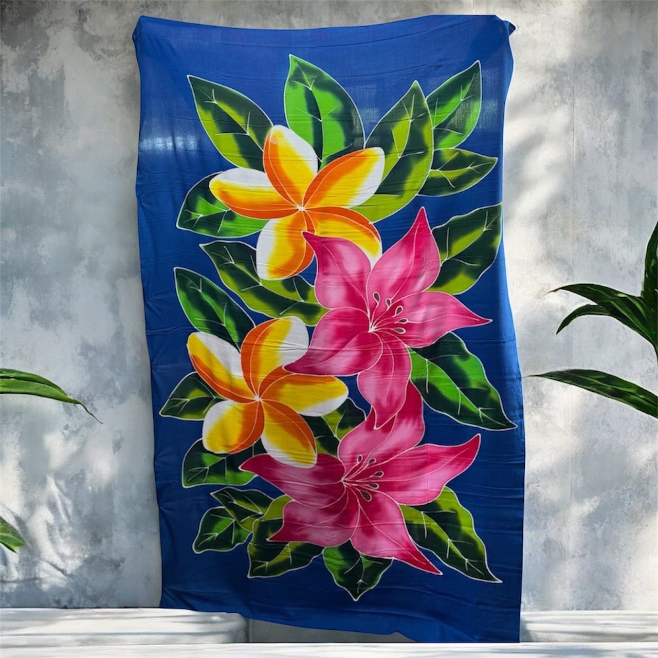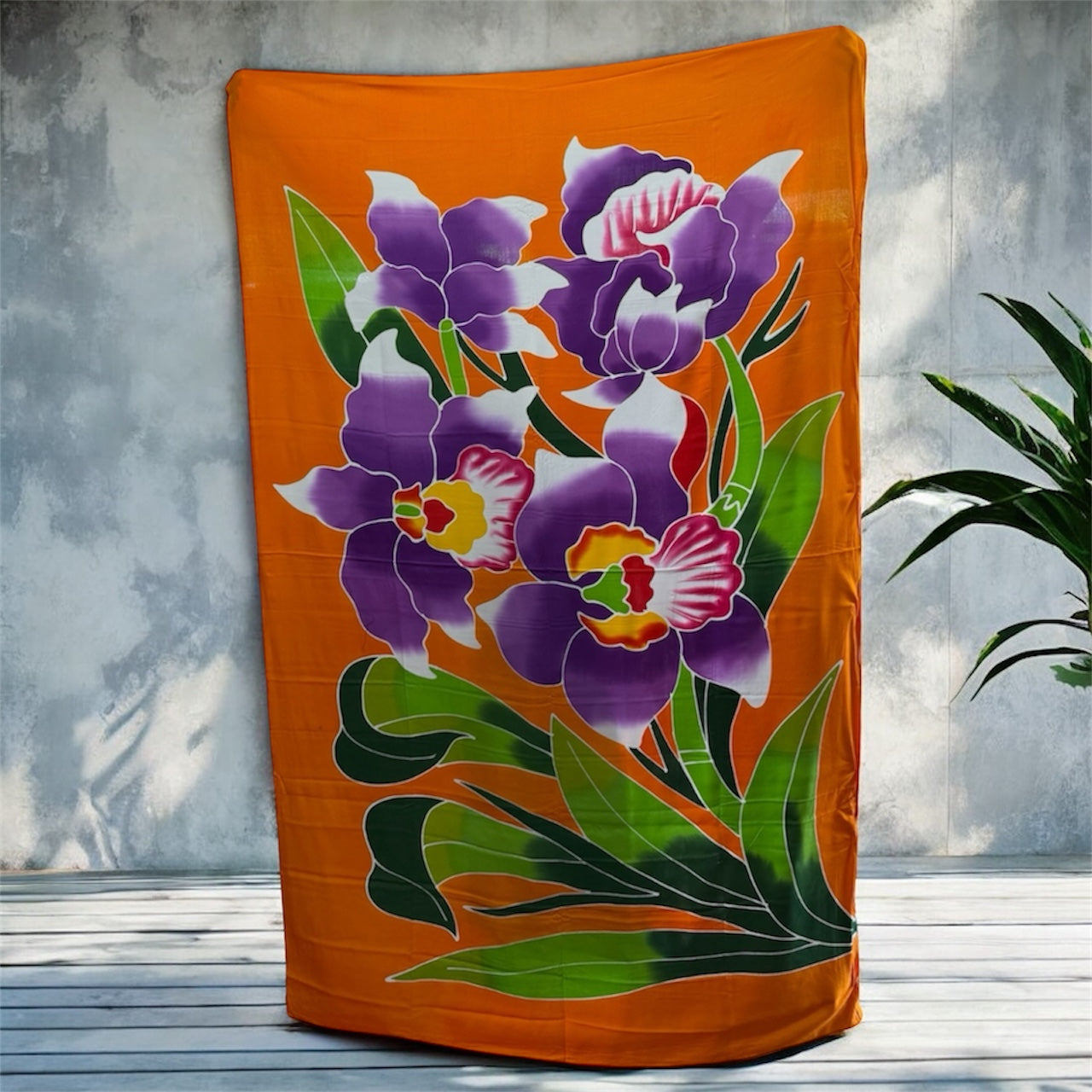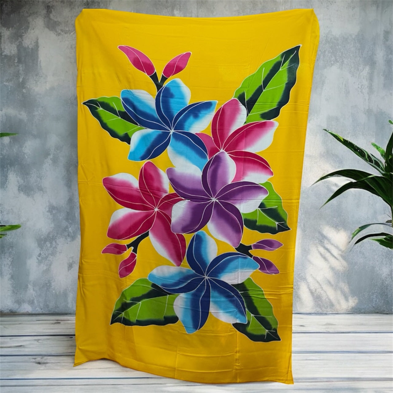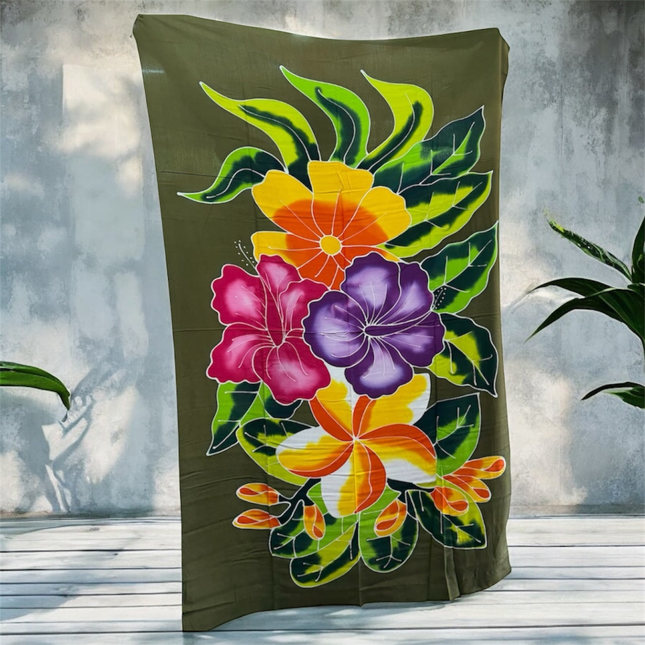 Crafted from a soft, lightweight fabric (such as rayon or similar), these beautiful wraps feature a bold central motif of colorful, exotic flowers like Hibiscus, Plumeria (Frangipani), and Orchids, set against a variety of rich, eye-catching background colors. The vibrant, hand-dyed look makes each piece feel like a unique work of art.